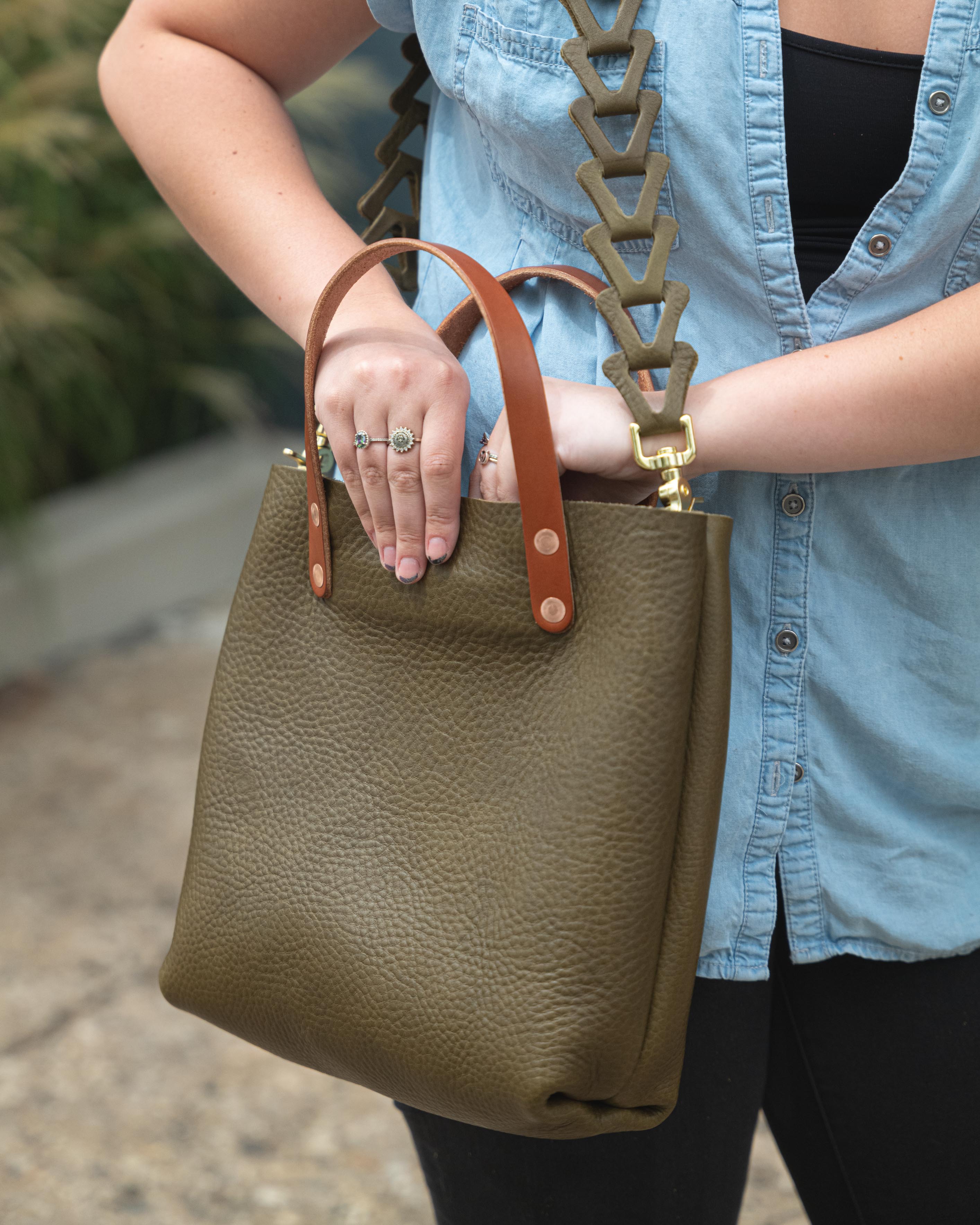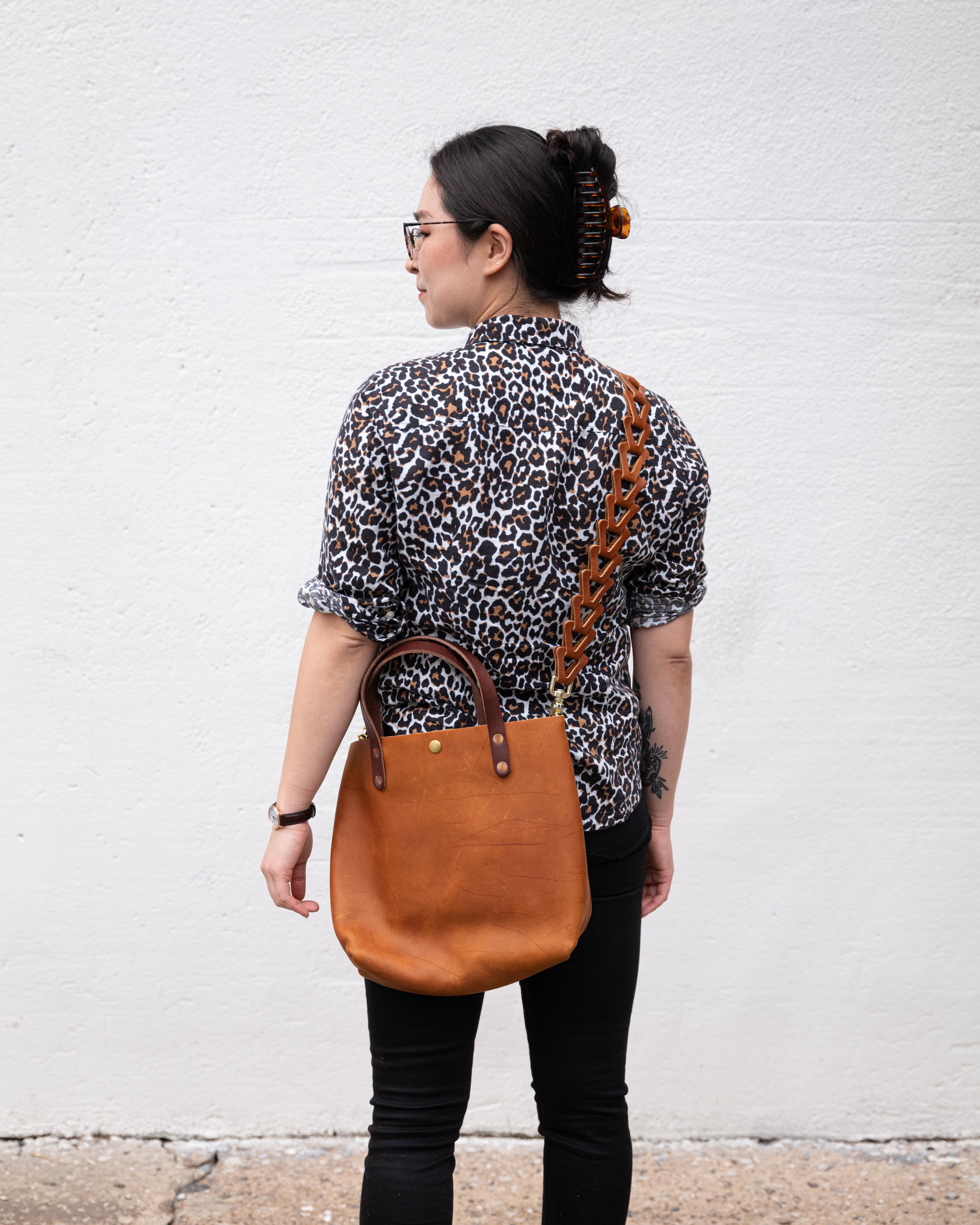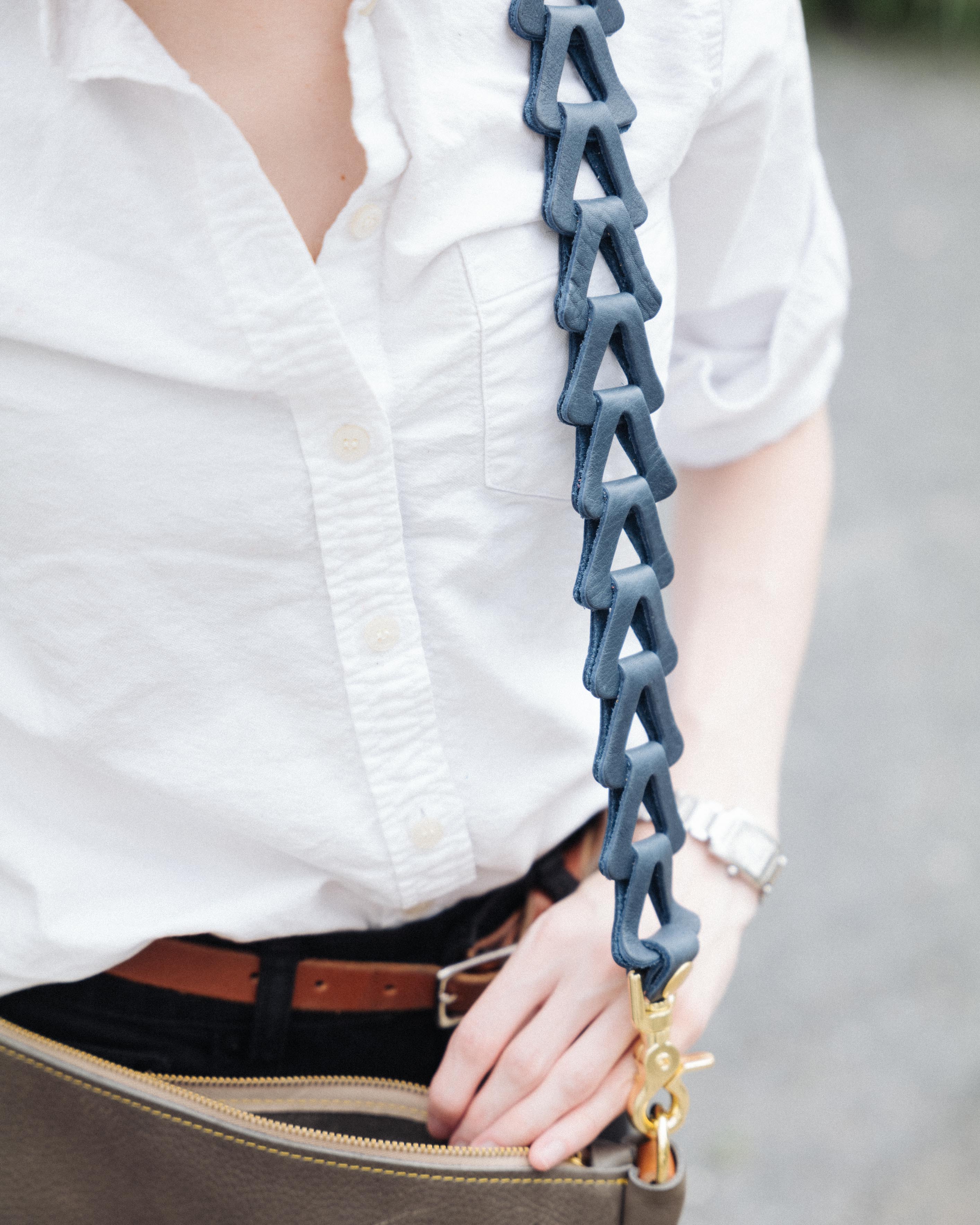 A strap is constructed of individual leather links, which loop through one another. That means it's endlessly adjustable and easily customizable. Add or remove links to get a long crossbody strap, a short shoulder strap, or anything in between!