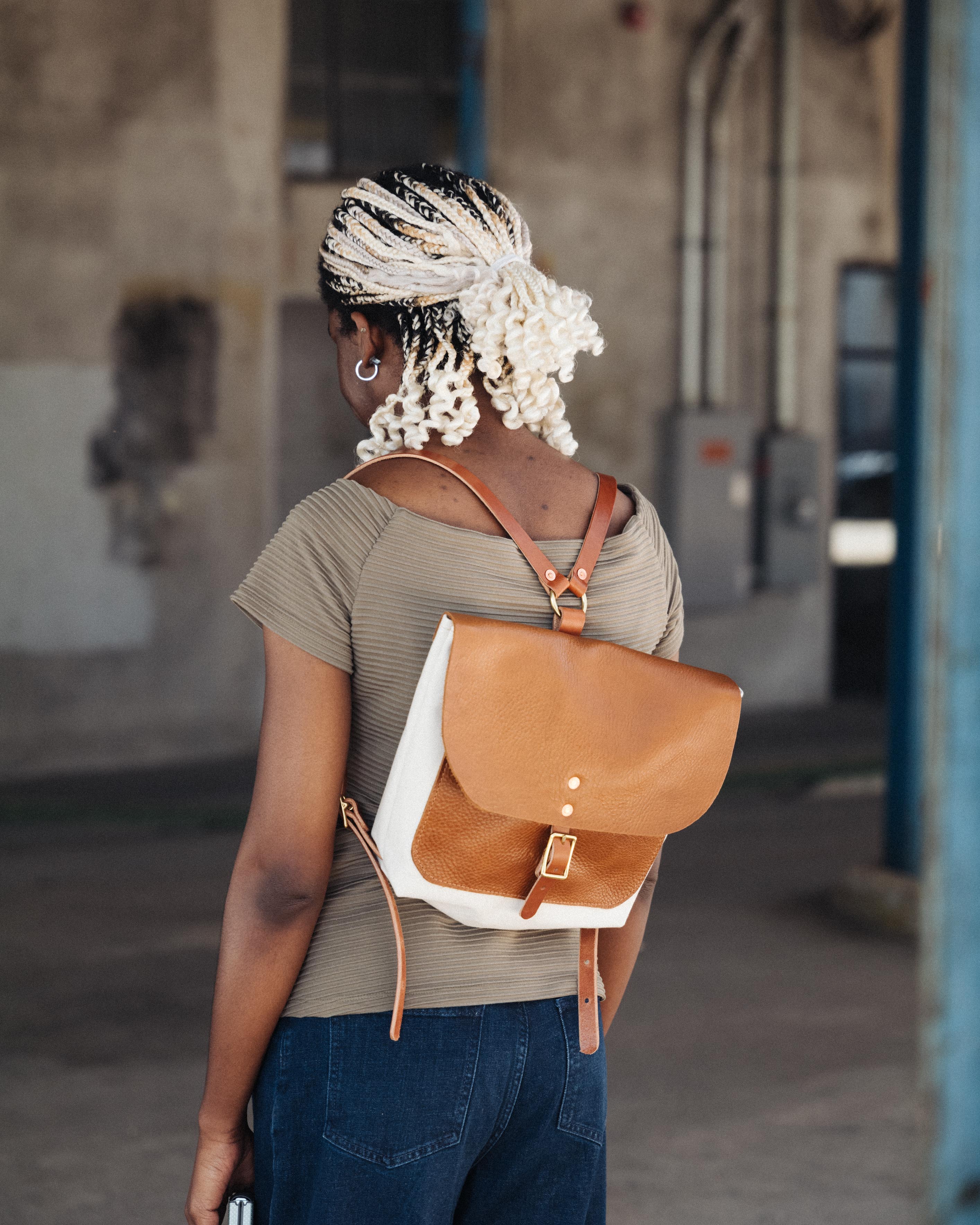 We offer two strap and trim options for the backpack. One is our classic belt-weight leather, which feels sturdy and robust (but gets softer with wear!). The other is a two-ply stitched option that matches the body of the bag and feels luxurious and extra comfortable. We love them both and didn't want to choose between them — so the choice is up to you!