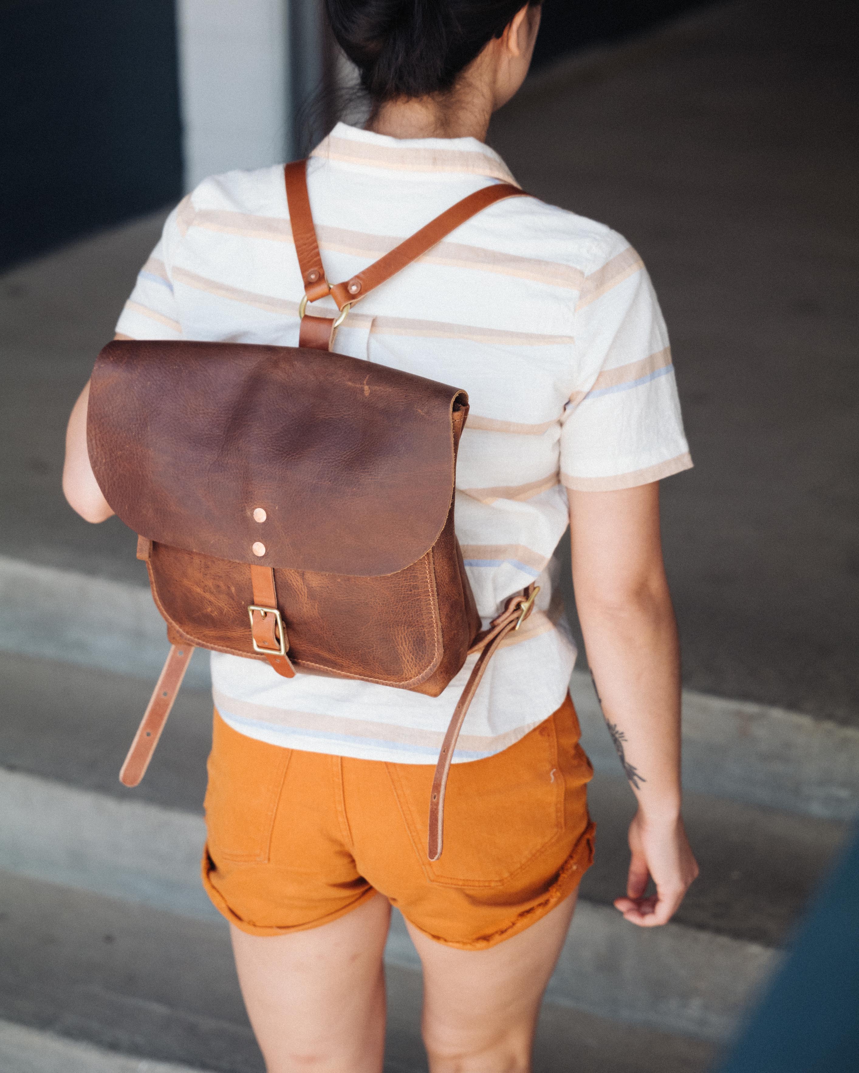 Our backpack, like every bag in the KMM & Co. collection, is handmade in the USA of full-grain leather. That's the highest quality leather made, and we stock more (and brighter!) colors than just about anyone else. The backpack is also available in some of our favorite leathers from Horween, a beloved family-owned tannery in Chicago.