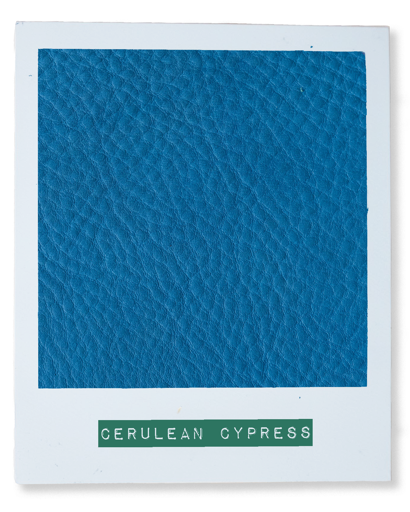See more in Cerulean Cypress, a thick and soft leather with a pillowy texture, even bright blue color, little to no pull-up, and pebbled grain.