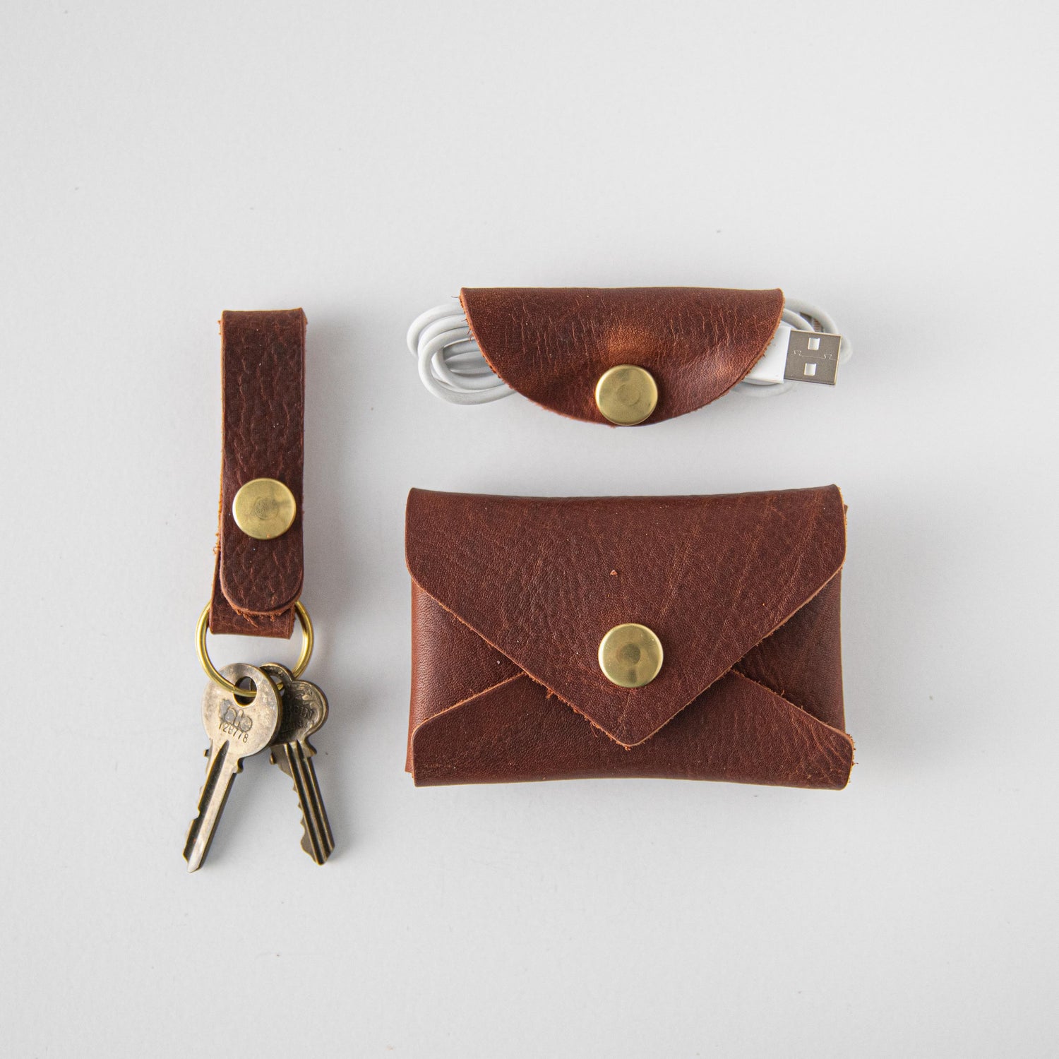 Everything is handmade of full-grain leather, the highest quality of leather available. Full-grain leather retains all of its original grain and character, including any imperfections. And full-grain leather acquires a beautiful patina with wear and use.