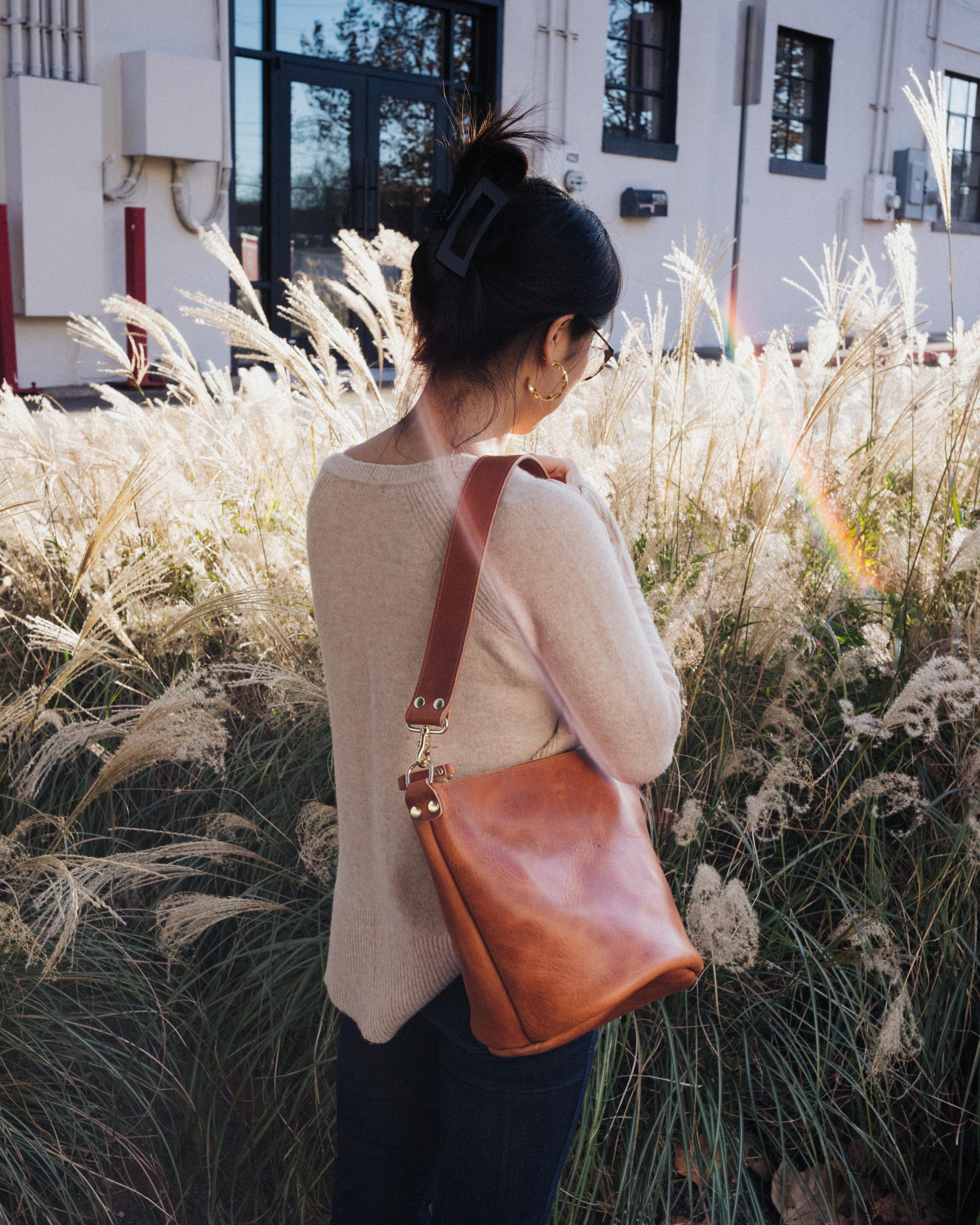 Like every KMM & Co. bag, your zip-top bucket bag is handmade in our Atlanta studio, and it's made to order, just for you. You can choose from a colorful range of amazing full-grain leathers. Plus, you can pick which crossbody strap is perfect for you: the endlessly adjustable chain link strap, or the soft and squishy two-ply strap.