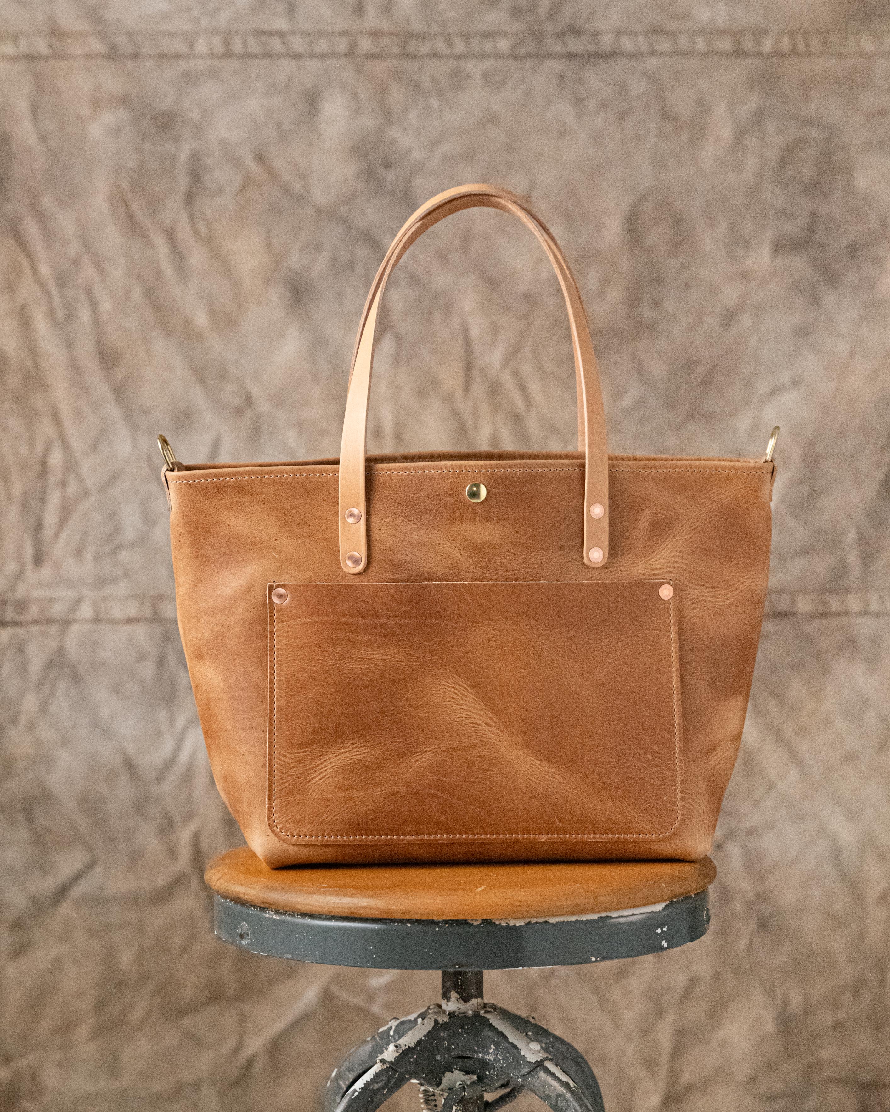 Next, we stitch the pocket onto the bag, reinforcing its corners with copper rivets. We also hem the top edge of the bag for a beautiful, polished finish. Then, we cut the handles in the length and color of your choice out of belting-weight leather, which breaks in beautifully with use.