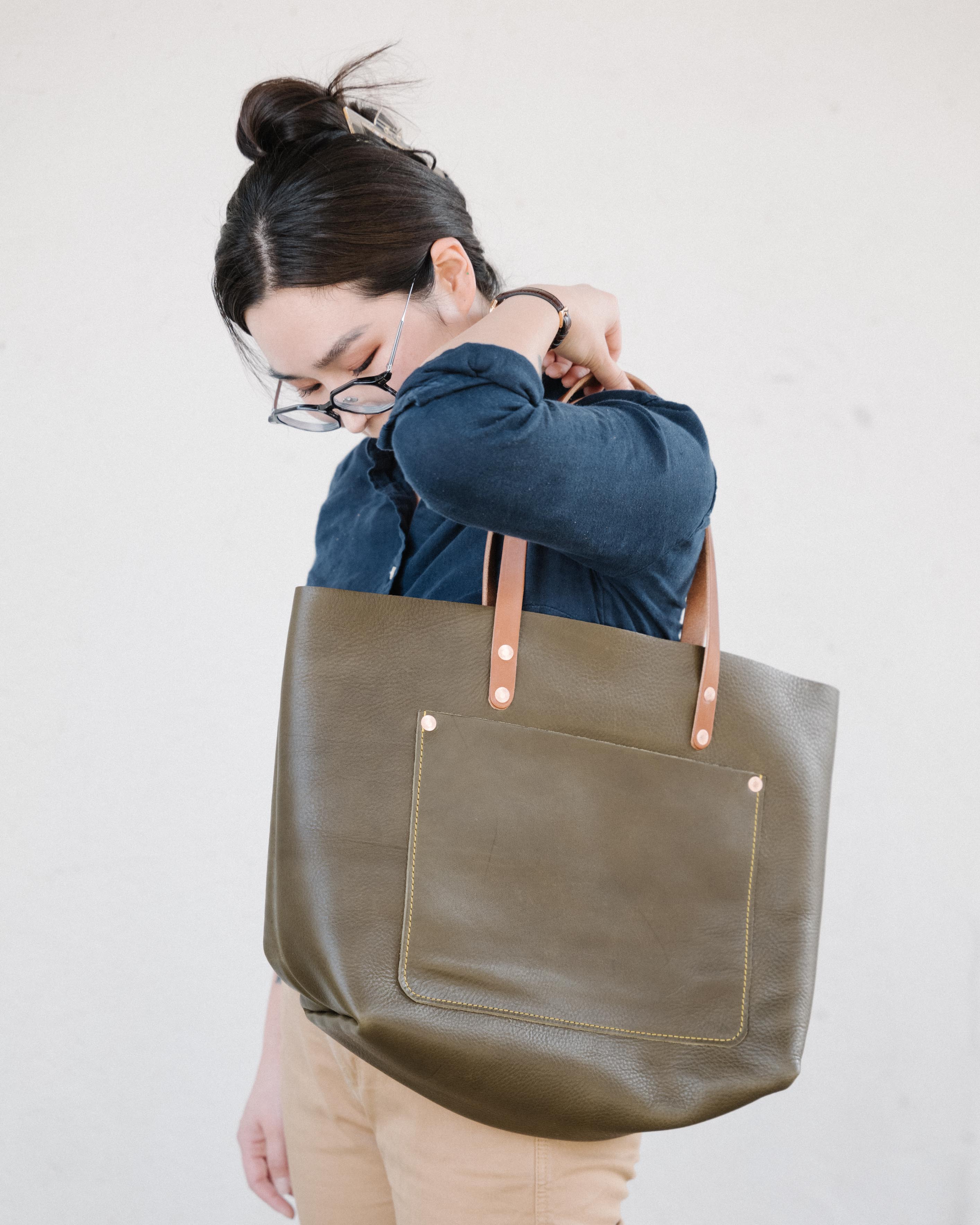 The classic tote has been our best-selling silhouette since the beginning. For many people, a tote has enough space for everyday use. But if you tend to carry more or larger items – like a big laptop, an extra pair of shoes, or a bagged lunch – you might appreciate the extra space in a market tote.