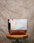 This year, we’re planning some fun, small-production bags and accessories that are ready (or almost-ready) to ship. This first batch of bags is made from our remaining stock of hair-on-hide leathers. We decided to pair each of these slouchy cow sides with our Tan Bison leather to add a little structure. We decided to leave the handles off for the moment, so you can still pick between matching two-ply Tan Bison handles or your choice of belt weight handles, at no additional charge. Each bag will also include a free matching tag — plus a complimentary comb so you can brush your new emotional support bag. The first photo is the “front” of the bag and the second photo is the “back” of the bag.