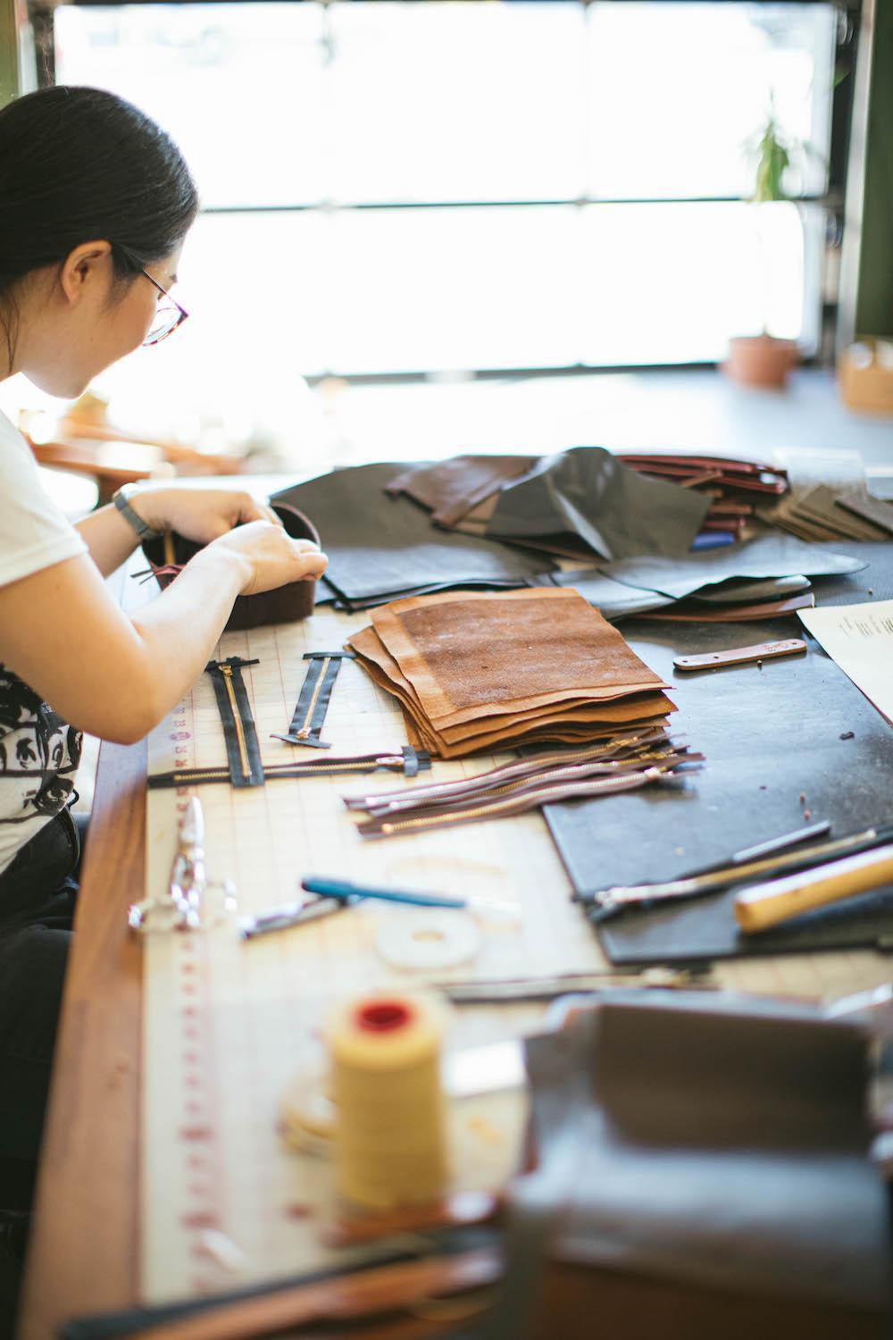 Each bag is handmade in the USA (in our Atlanta studio)! It all begins on the cutting table, where we select the perfect side of full-grain leather for your crossbody bag. There's a front, a back, and a gusset, and we consider the color and grain of each piece.