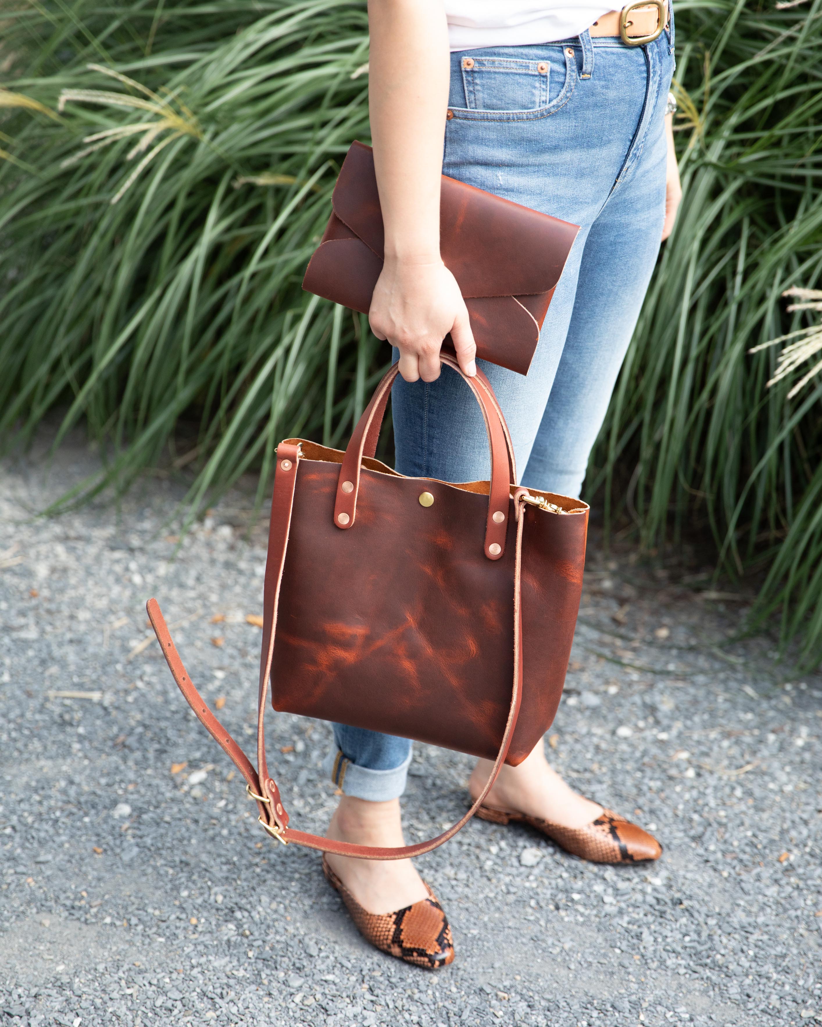 The zip pouch is handmade of beautiful full-grain leather, with a solid brass zipper that features a big and beautiful "donut" pull. It's the perfect accessory to organize items in your tote or to carry on its own. The small zip pouch measures 5.5 inches by 7.5 inches, and the medium zip pouch measures 7 inches by 9.5 inches. We've made some changes to our product line over the years, and we have a whole lot of great small goods that we’re closing out! Whether they’re made of the last of a discontinued leather, were assembled with a discontinued thread or hardware color, or have a cosmetic blemish, these accessories are ready for a new home! Get a major discount on a silhouette you've been wanting to try, and we’ll pick it from the wall and get it to you ASAP! To sweeten the deal, these are all 50% off in your cart. So shop, save, and enjoy the surprise!