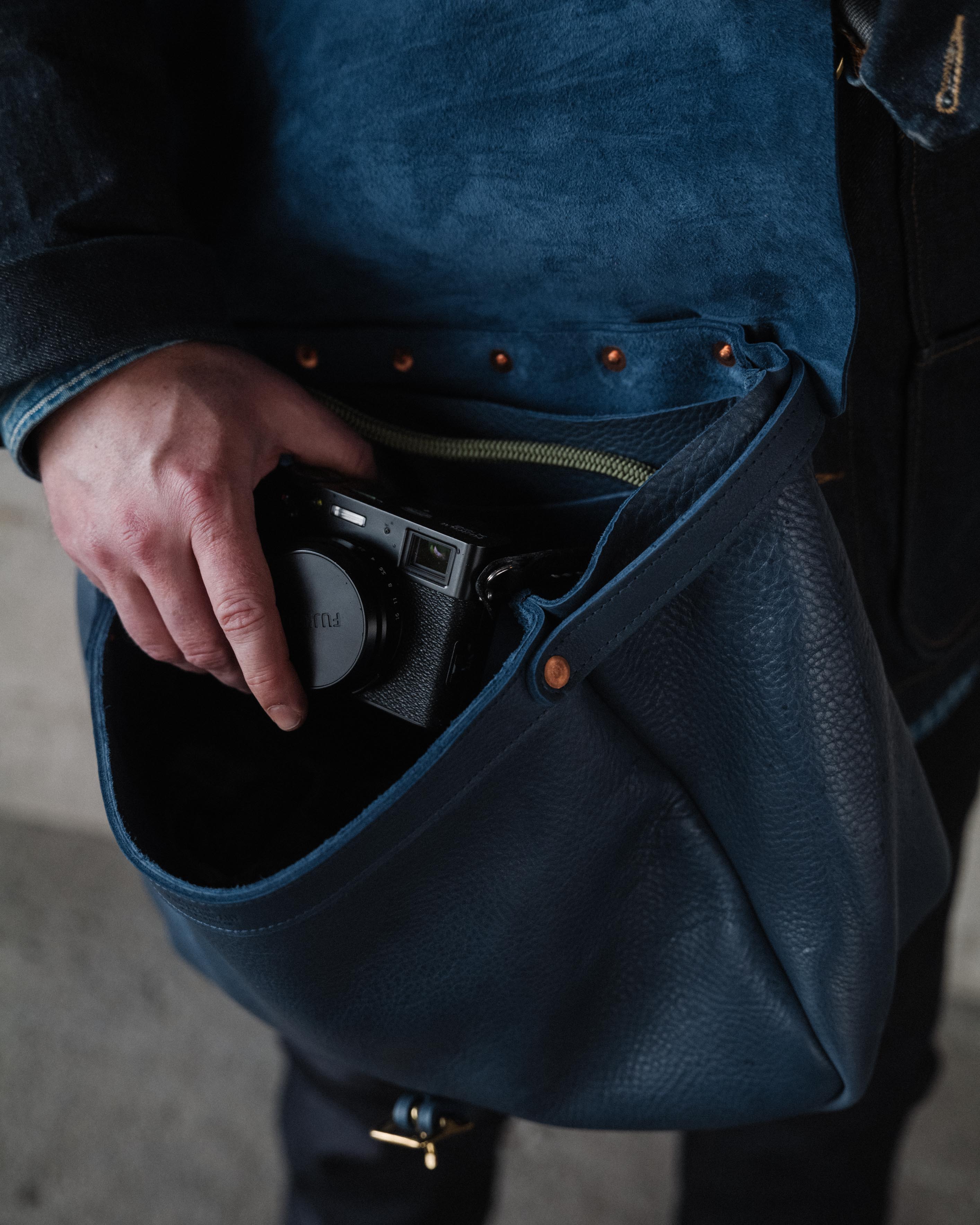 Next, we attach the flap of the messenger bag and affix the interior pockets using a handful — quite literally — of traditional copper rivets. Every rivet is set by hand, just like it's always been done. And we set our rivets with the smooth side out for a clean look and snag-free carrying.