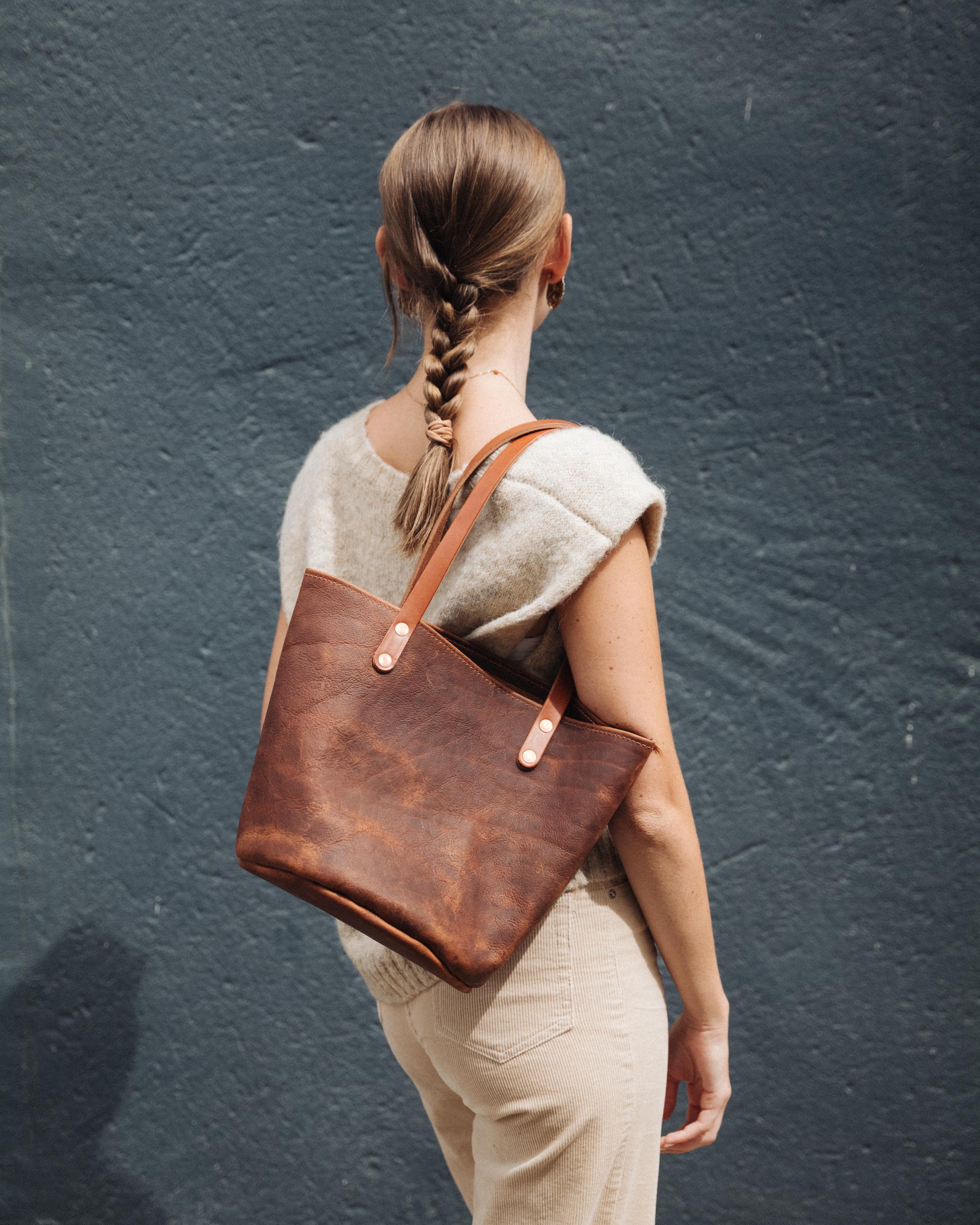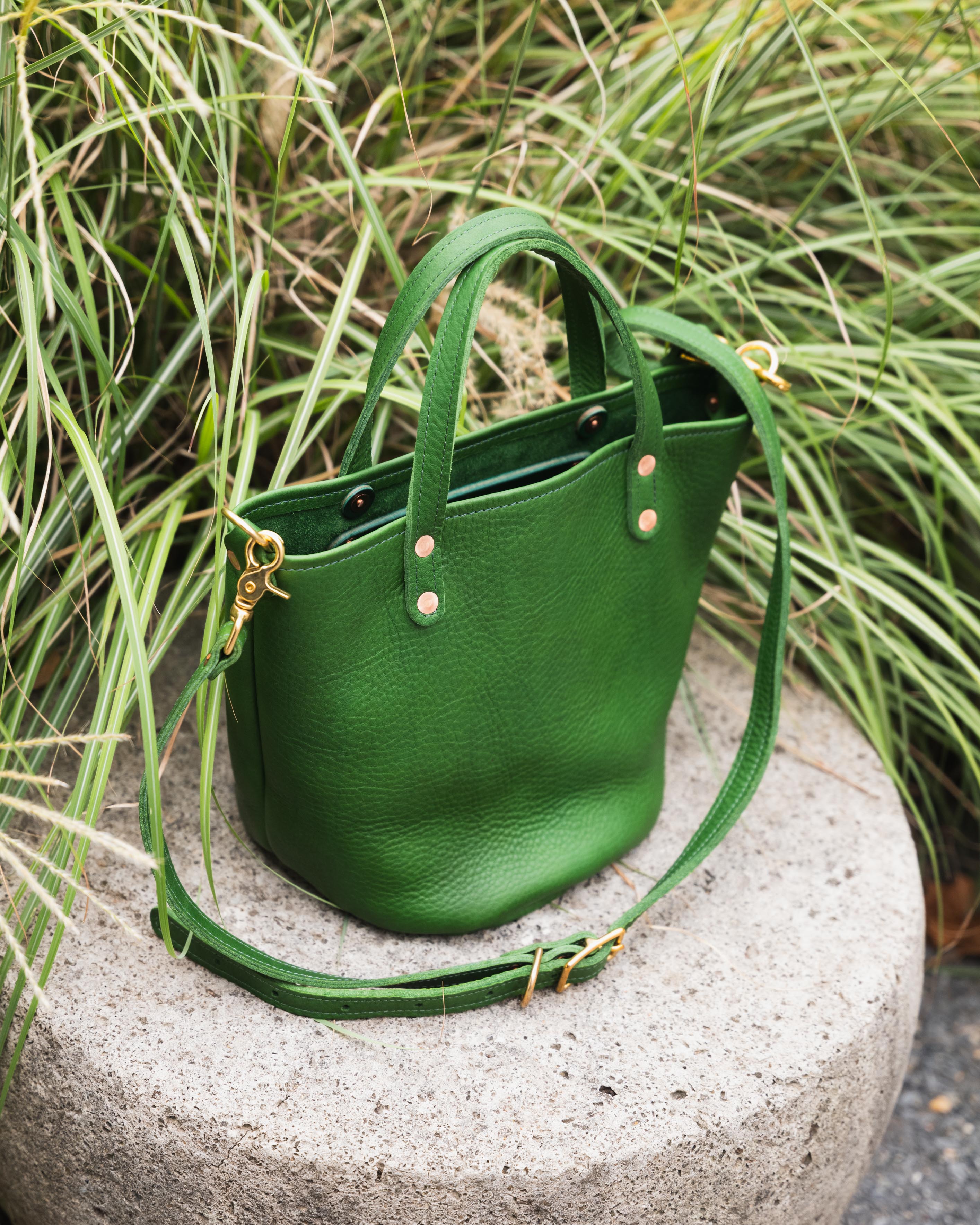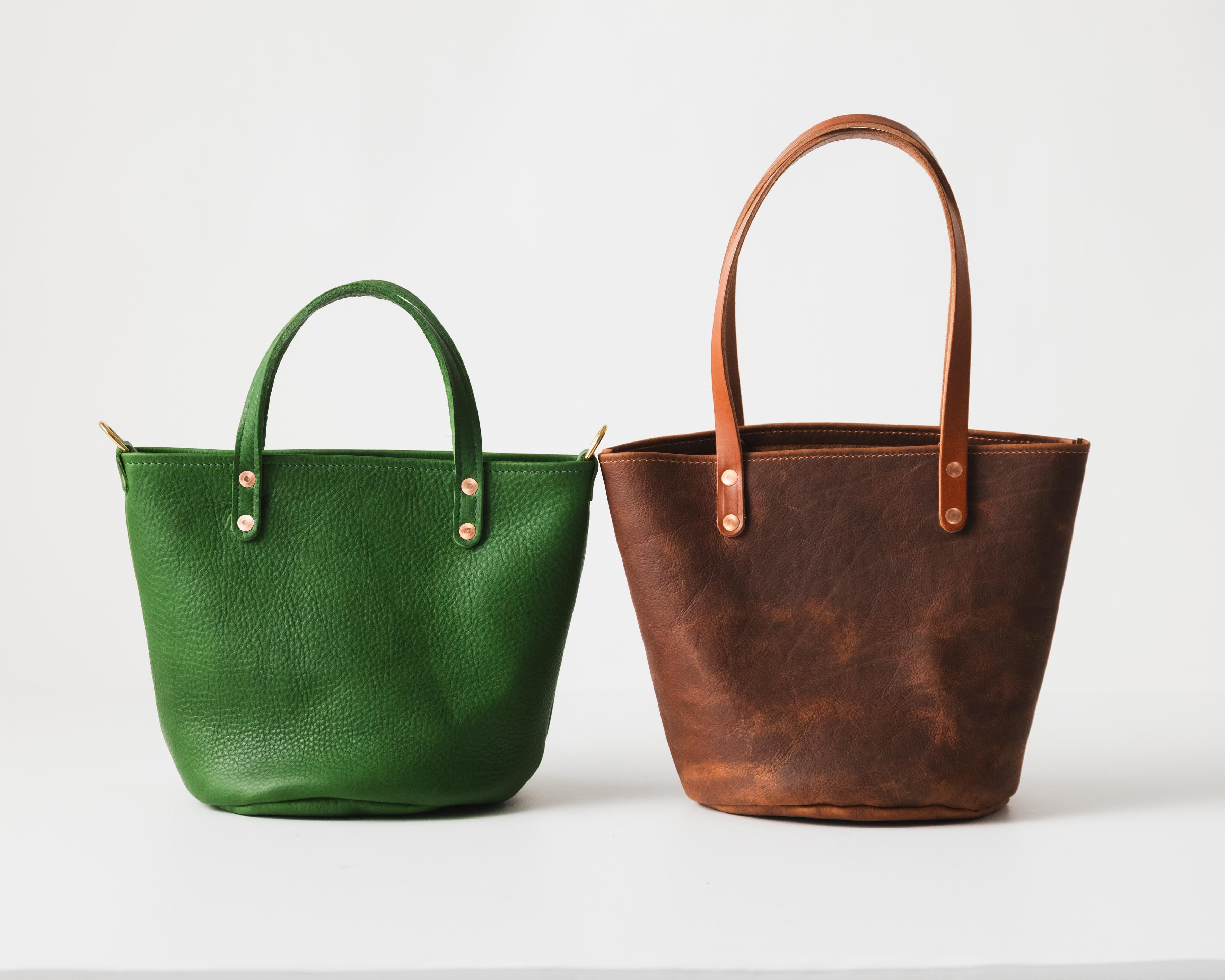 From Cypress to Kodiak and beyond, the bucket tote is made of beautiful full-grain leathers. That's the highest quality leather made, with all the natural grain and character of the leather intact.