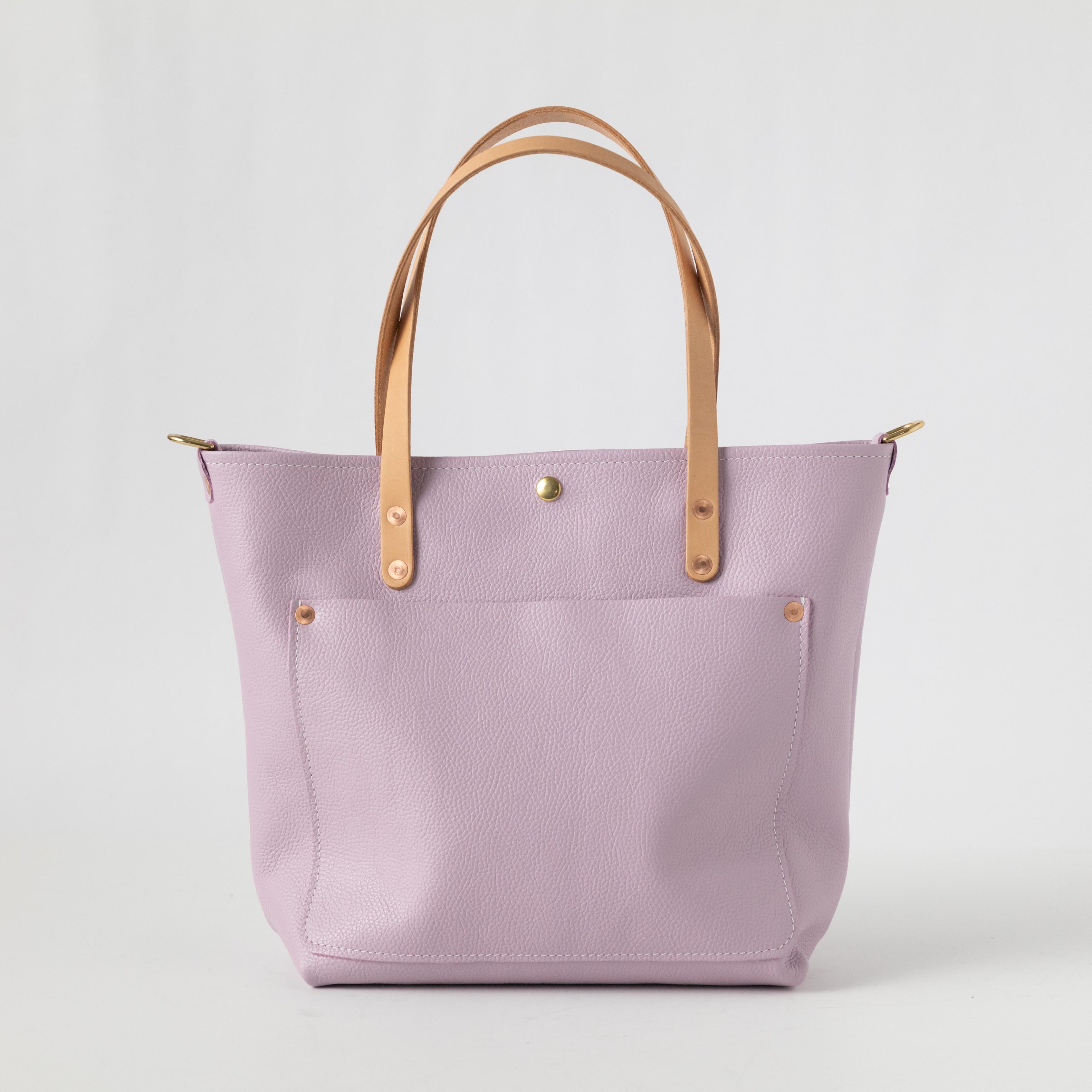 The Lilac Italian Pebbled Travel Tote is a handmade, full-grain leather tote bag. Lilac Italian Pebbled is a lightweight and soft leather, with a beautiful pebbled grain. The Lilac Italian Pebbled Travel Tote comes standard with Russet handles.
