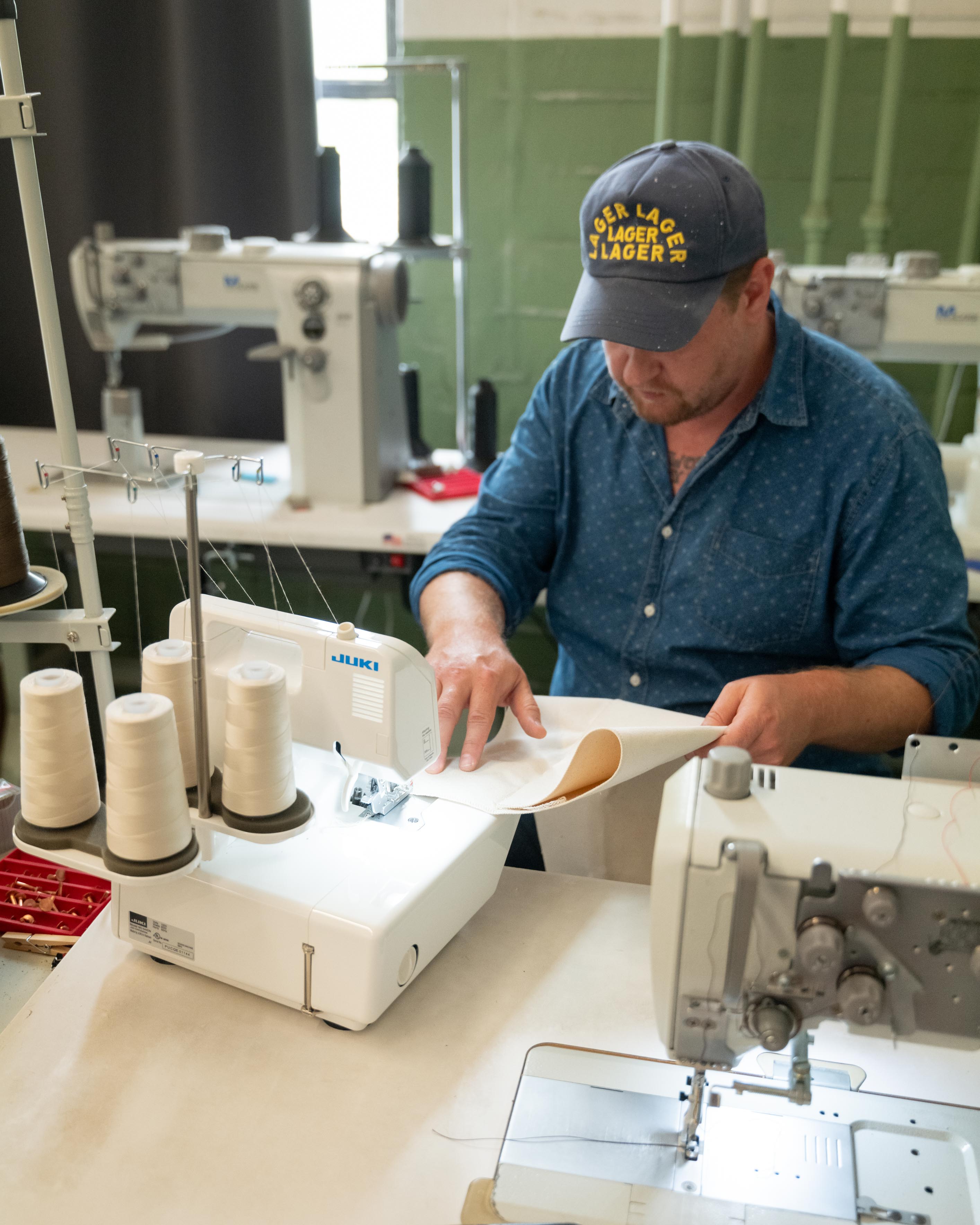Next, we serge the edges of that canvas to make sure it can't unravel, and we hem the top edge of the bag with a tonal topstitch for a polished finish. Then, we stitch the seams that form the body of the bag, backstitching meticulously to make sure everything is locked into place.