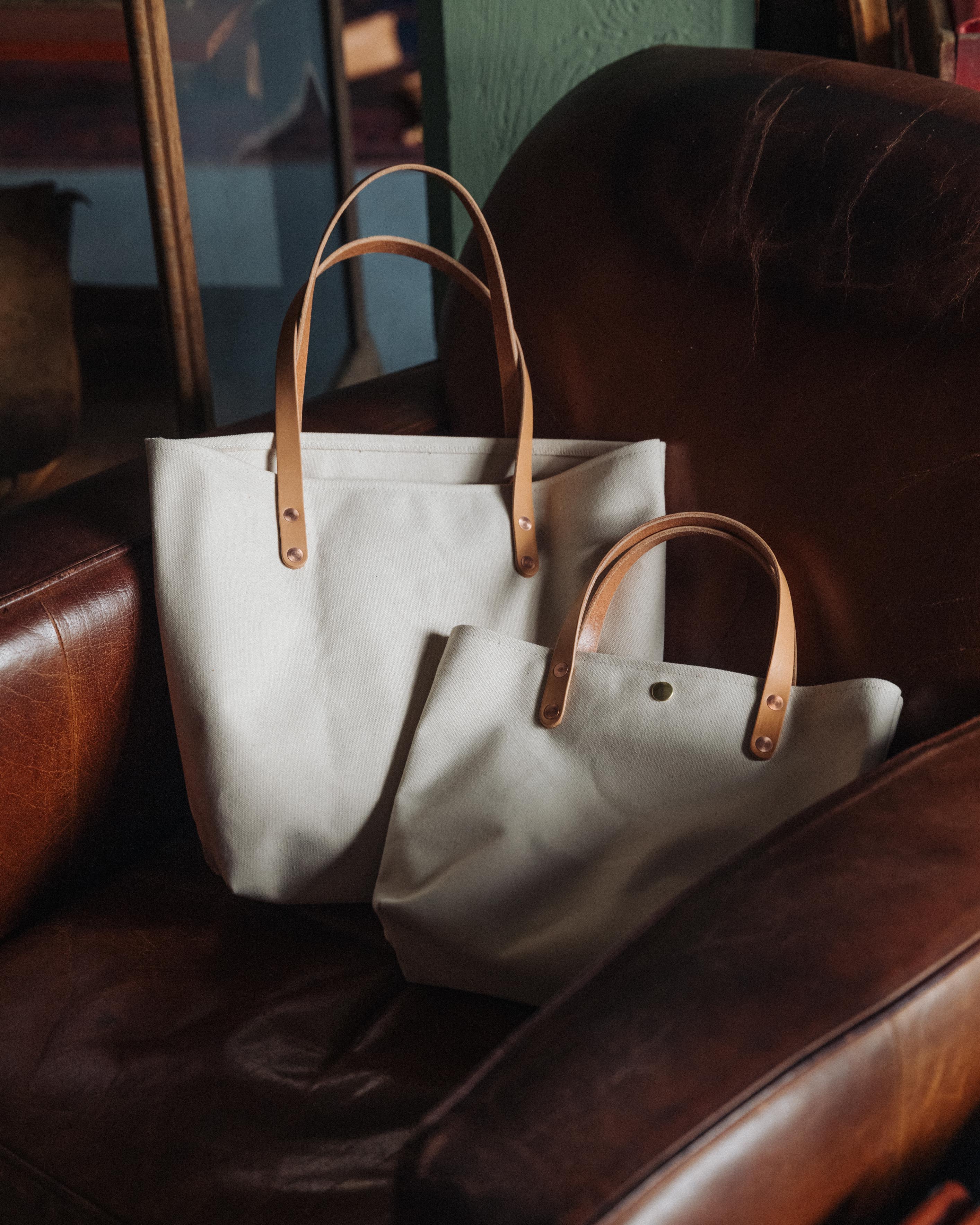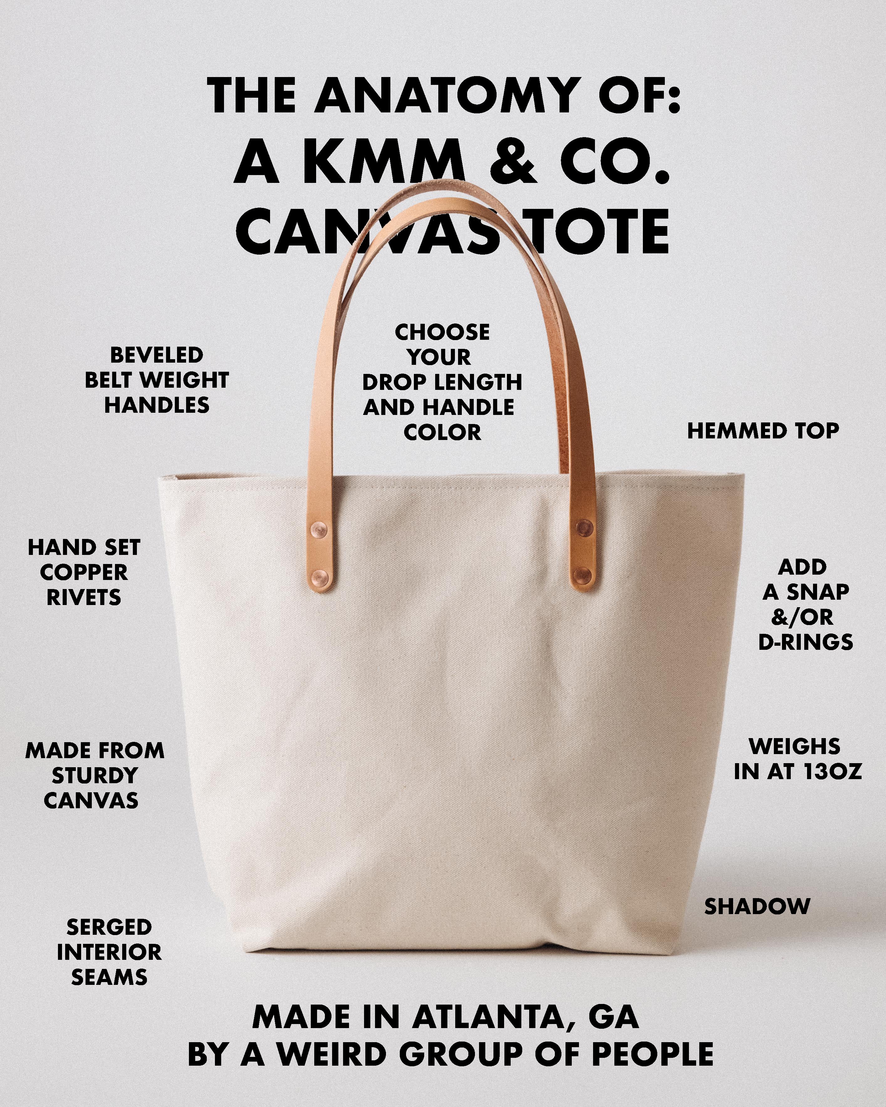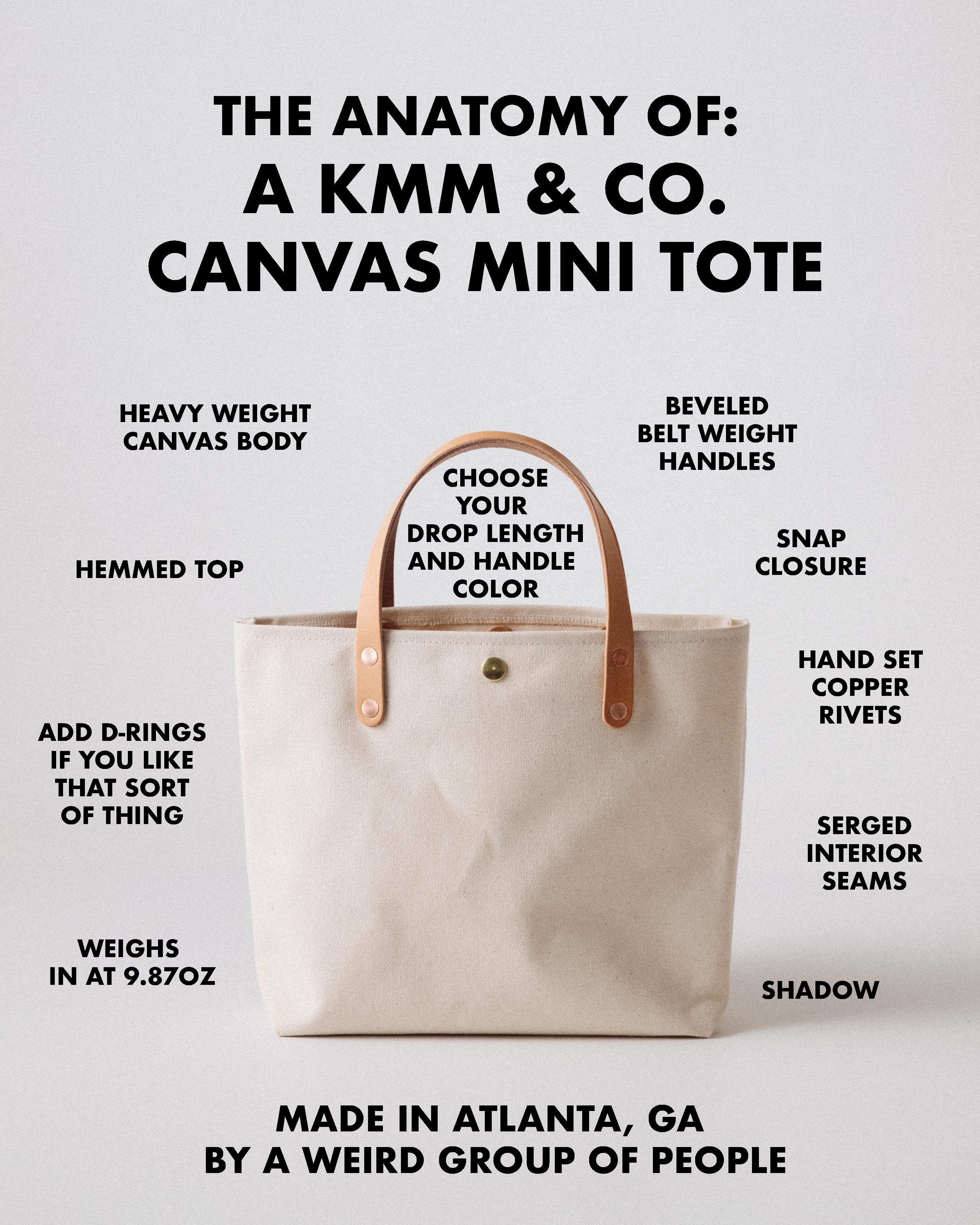 The canvas tote and mini tote — designs based on KMM & Co.'s two best-selling signature leather totes — are handmade of heavyweight canvas and full-grain leather. That means they feature the highest quality leather made, and we stock more (and brighter!) colors than just about anyone else.