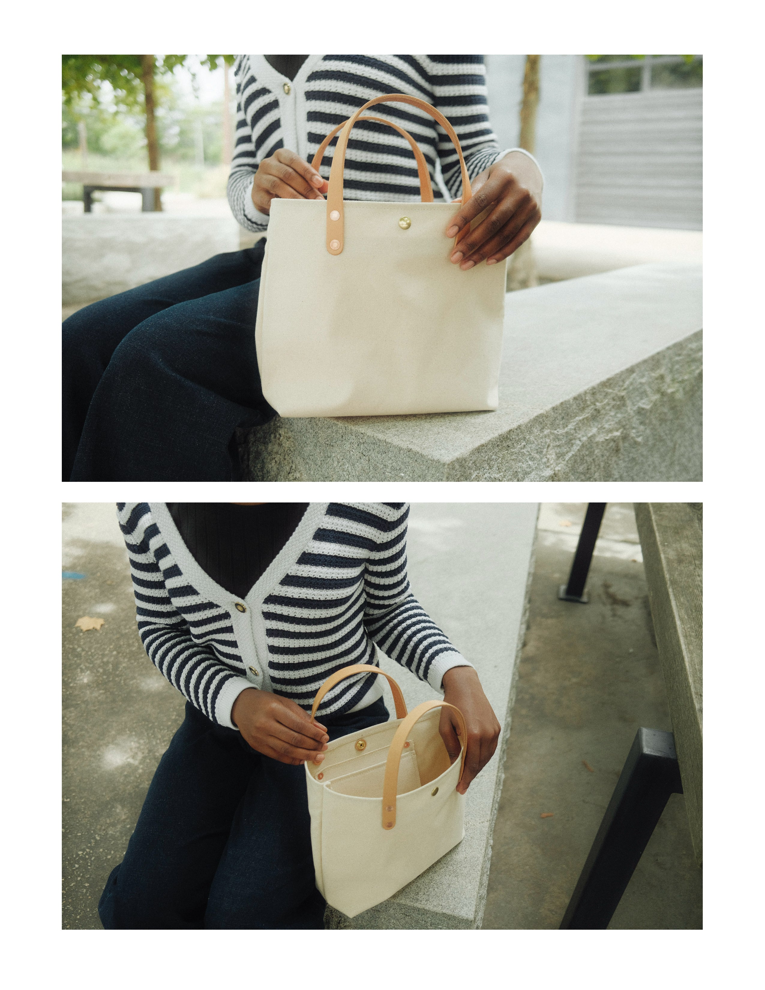 The canvas tote is the perfect bag for work, school, the weekend, and beyond. It can comfortably fit a 13-inch MacBook, a book, a notebook, snacks, a water bottle, a large wallet, zip pouches, a makeup bag – just about anything you carry everyday. The canvas mini tote is great for days you want to travel a little lighter: It can comfortably carry your tablet, a book, your wallet, your phone, and other essentials — and still have room for snacks!