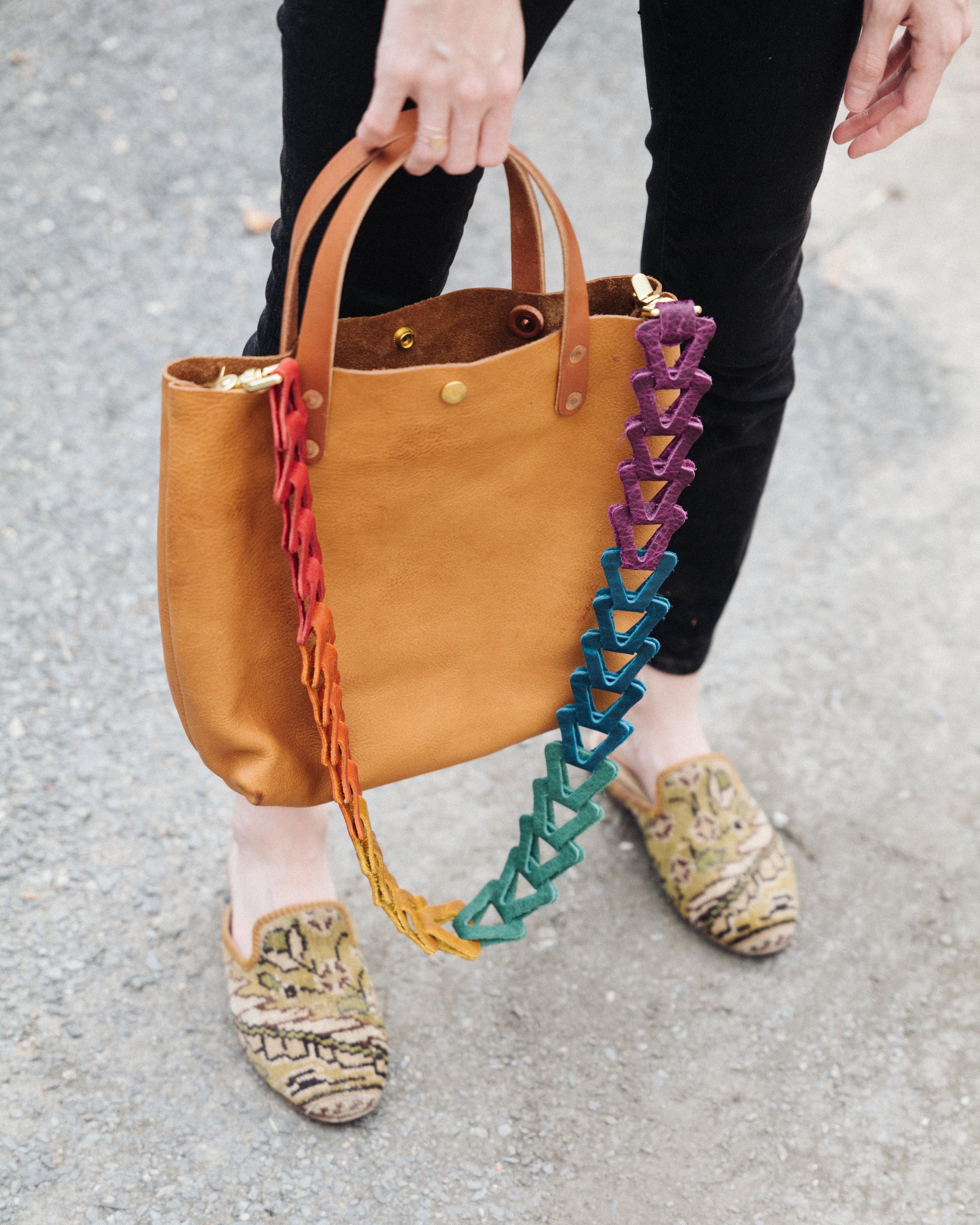 A strap is constructed of individual leather links, which loop through one another. That means it's endlessly adjustable and easily customizable. Add or remove links to get a long crossbody strap, a short shoulder strap, or anything in between!
