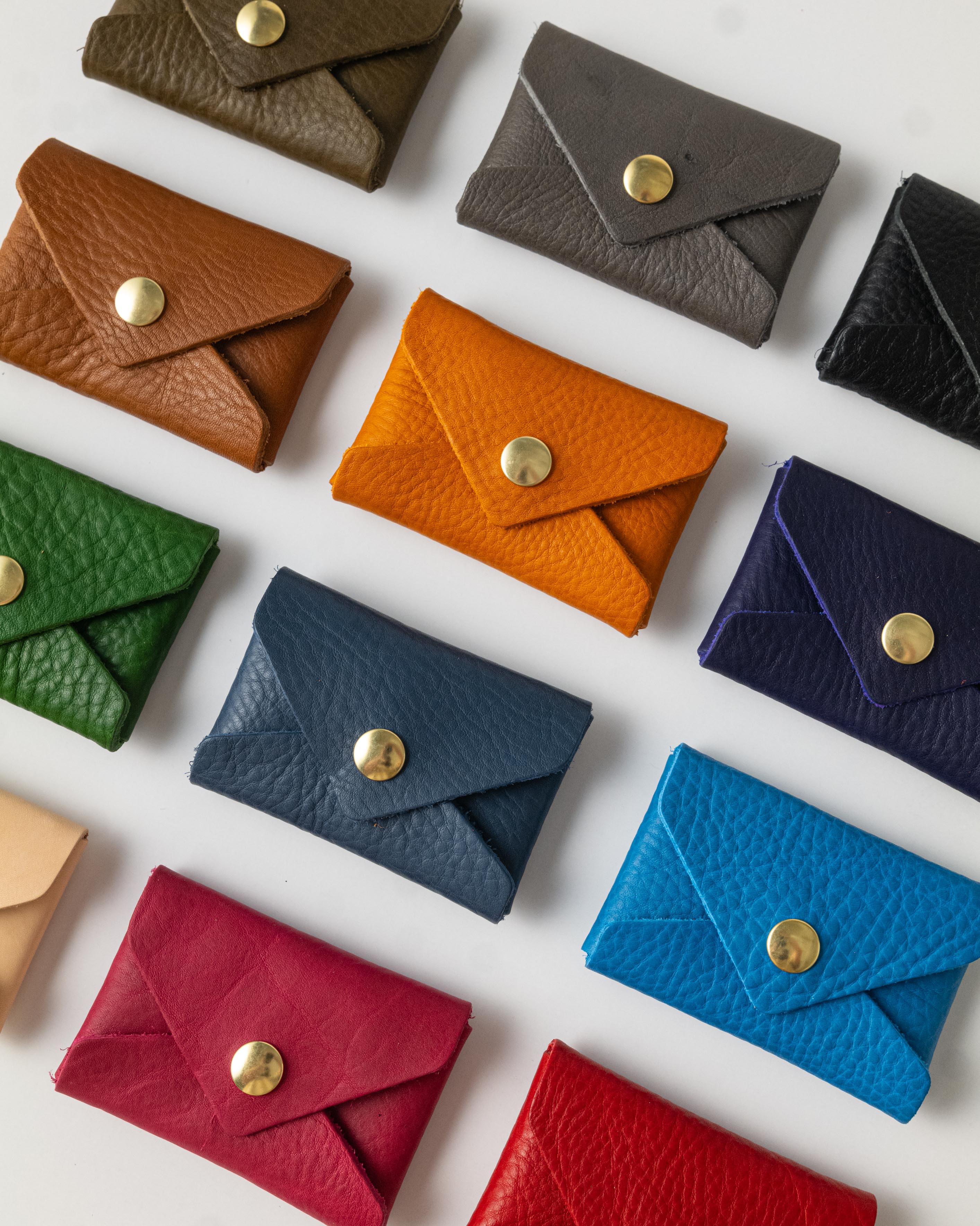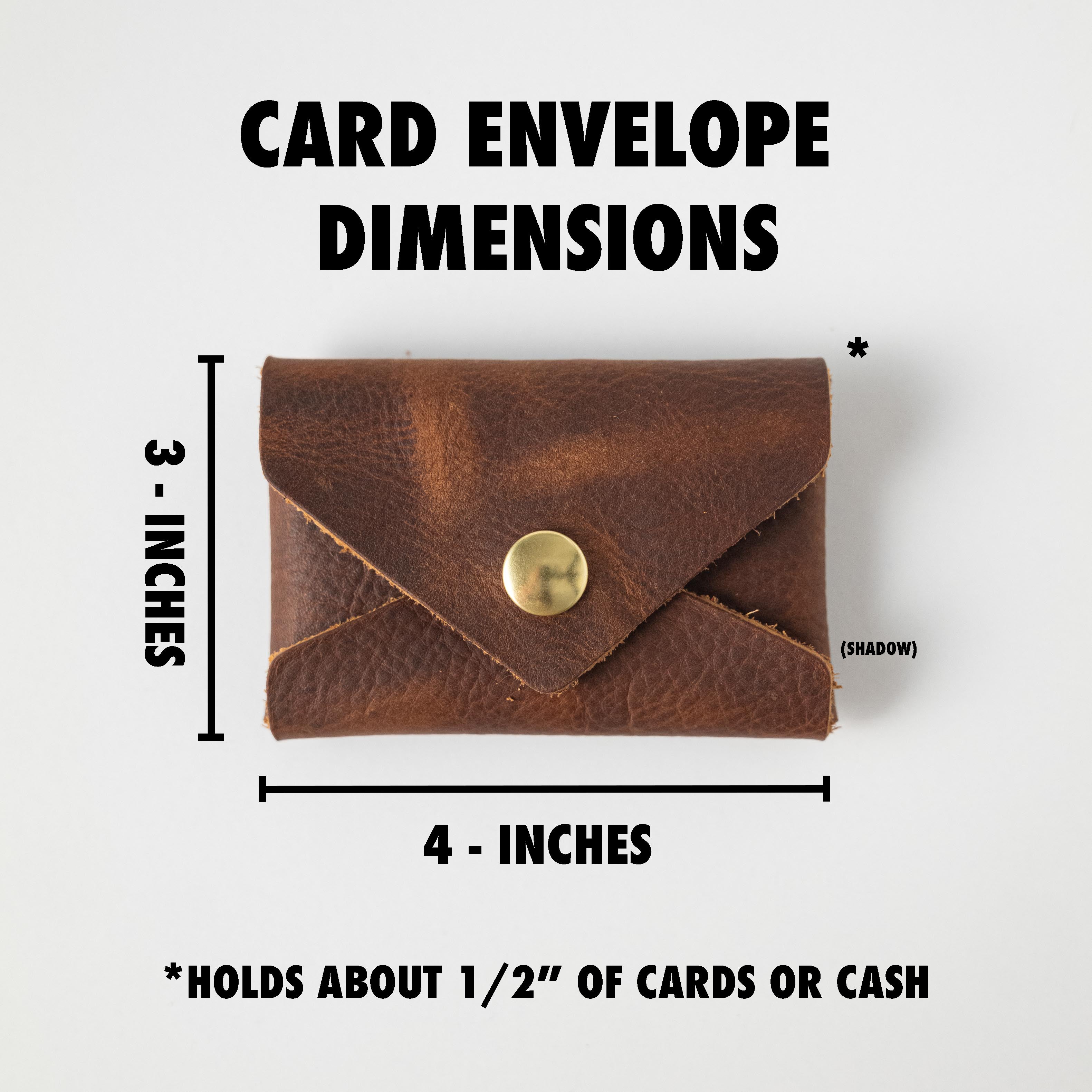 The card envelope is an elegant one-piece design that's held together with a beautiful, solid brass snap closure. Just like our leather, our hardware is made to acquire a patina and look more beautiful with age and use.