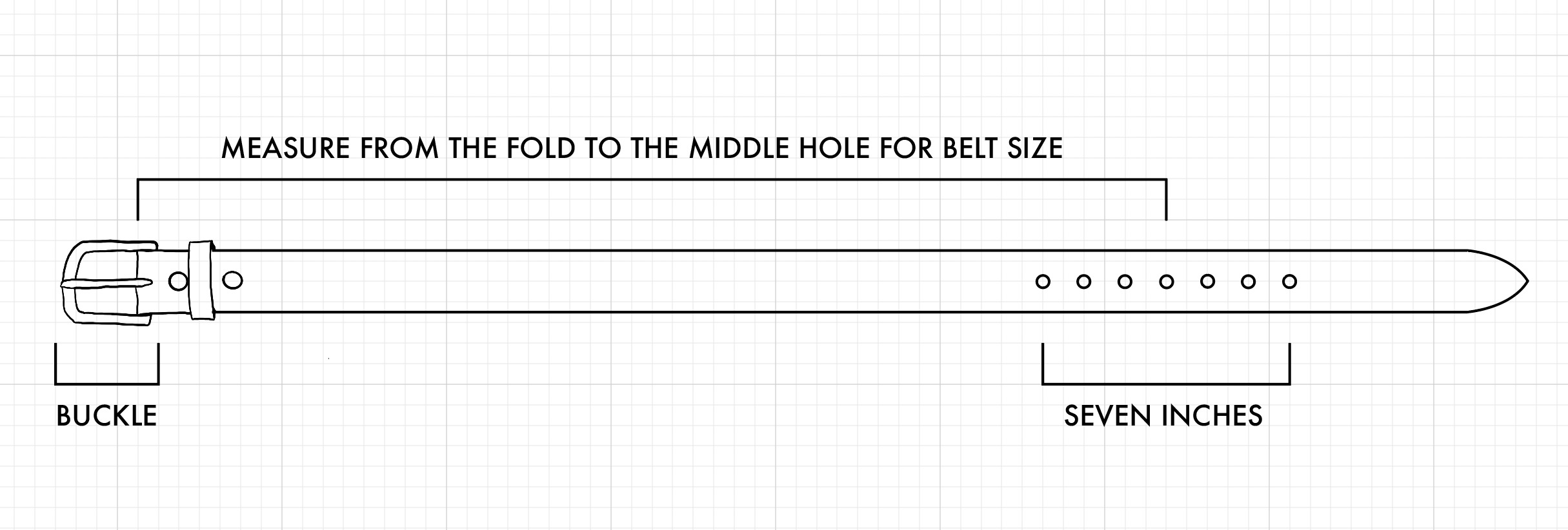 KMM & Co.'s leather belts are sized in inches, measured from the point where the belt folds over the buckle to the middle of the belt's seven holes. Here's what we recommend to get a perfect fit.