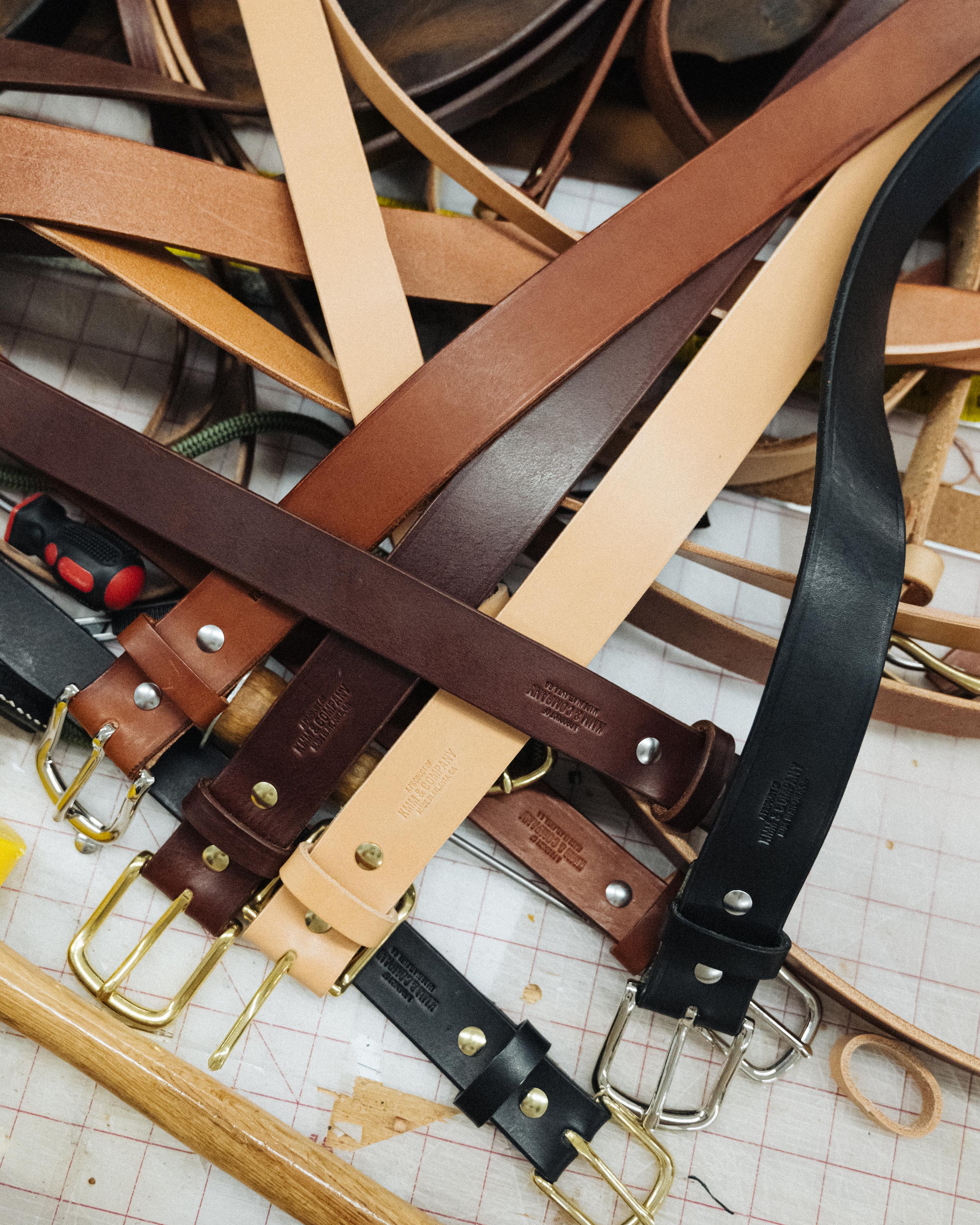 Each leather belt is handmade in the USA from start to finish! First, we use an industrial strap cutter — the same kind that saddle makers traditionally use— to cut a hide of Bridle leather into belt-width strips (either 1.25 inches or 1.5 inches). Then, we select the perfect strip and cut your belt to length.